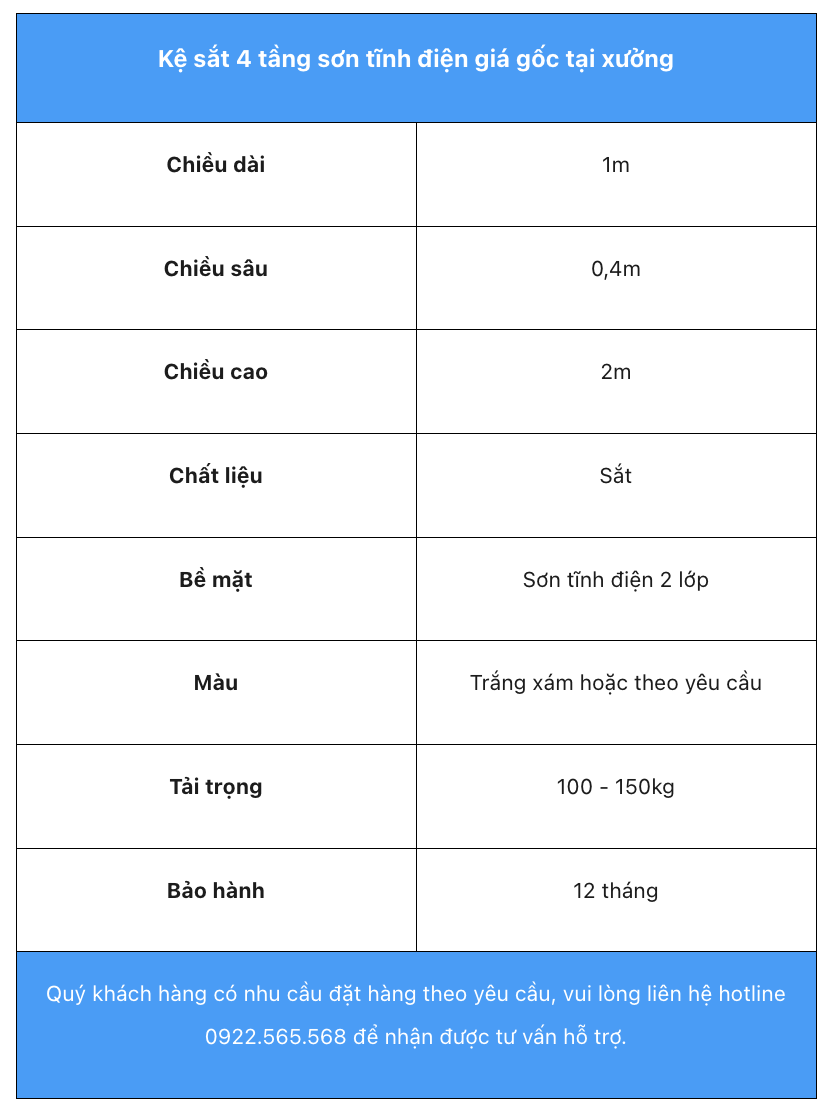 Quý khách có nhu cầu Báo giá Kệ sắt V lỗ 4 tầng theo yêu cầu, vui lòng liên hệ trực tiếp với Giá kệ HLT theo các thông tin dưới đây để nhận được tư vấn hỗ trợ nhanh nhất.