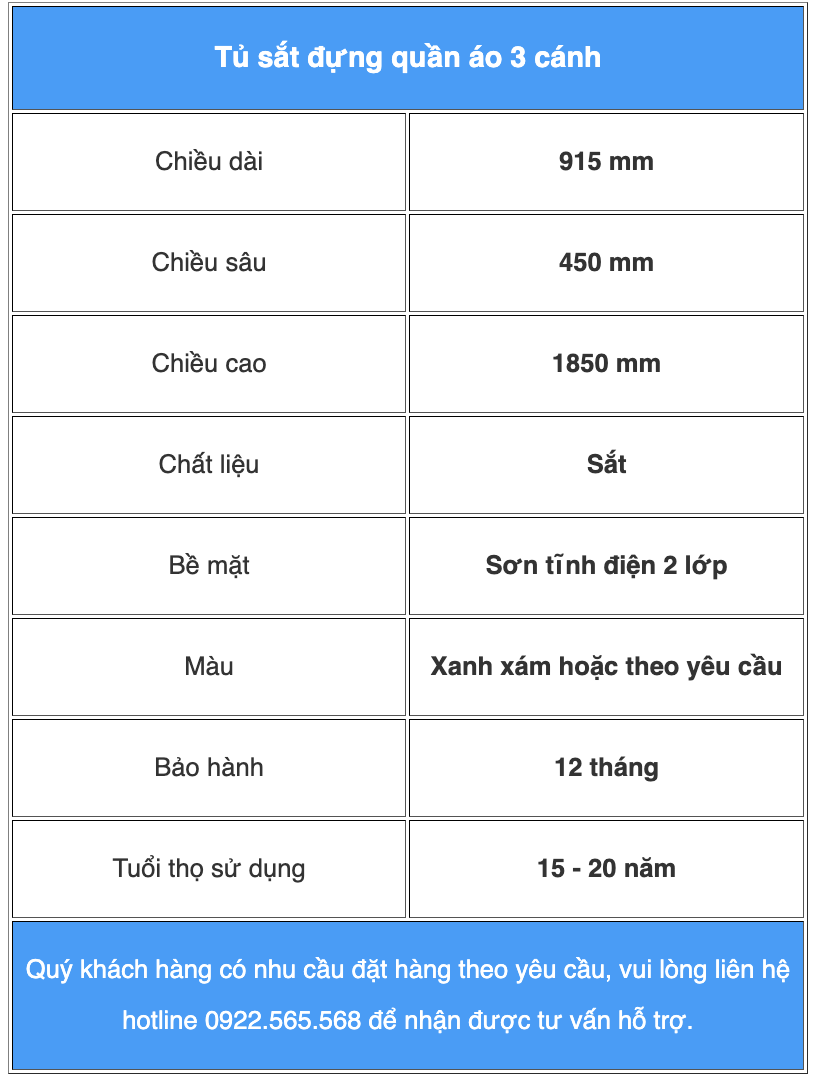 Tủ quần áo sắt sơn tĩnh điện có thiết kế dạng tủ sắt 3 cánh riêng biệt, giúp dễ dàng sắp xếp và tổ chức đồ dùng cá nhân. Tuổi thọ sử dụng của tủ có thể lên đến 15 - 20 năm hoặc hơn tùy mức độ giữ gìn.
